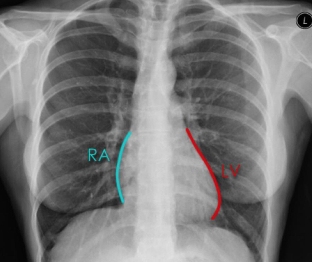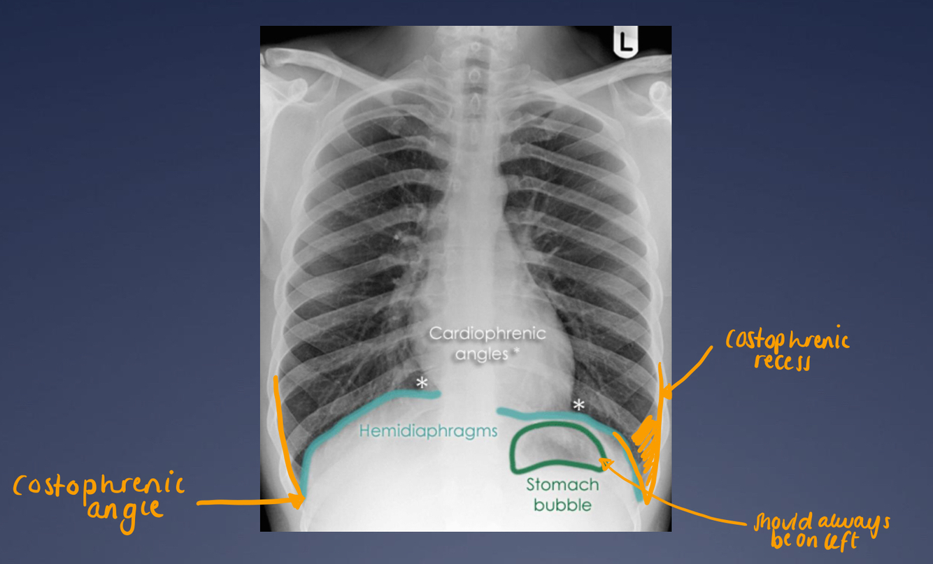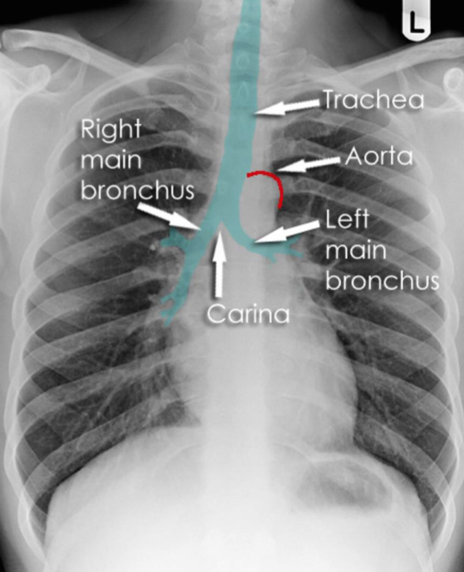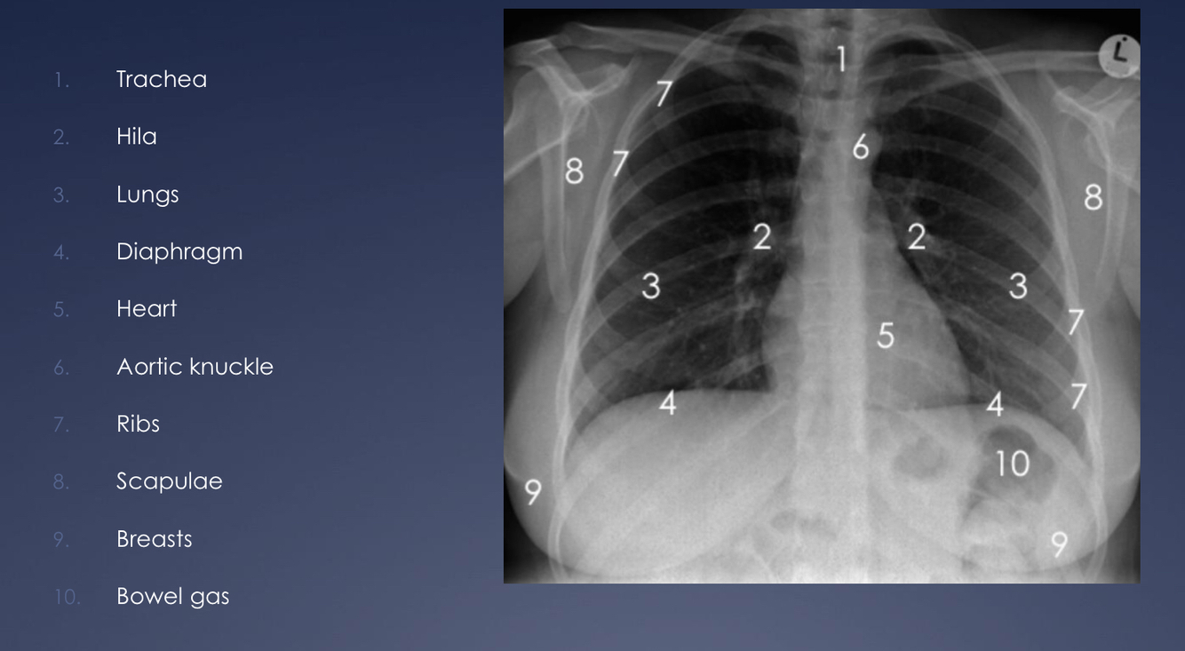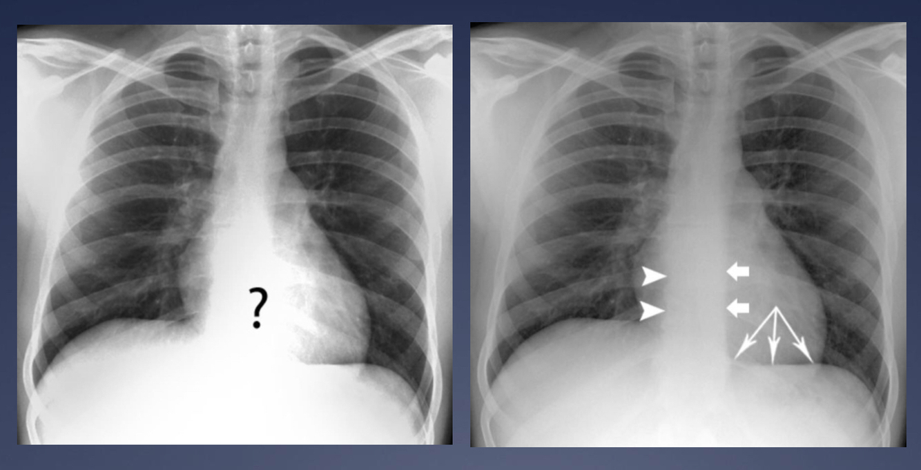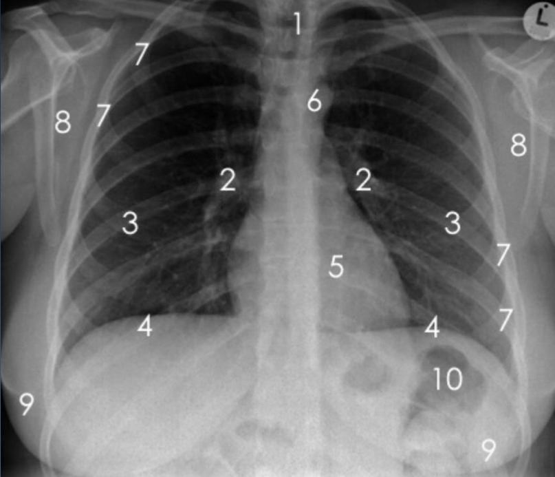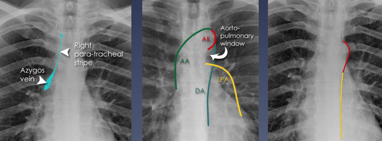 What contours should you see at the mediastinum, e.g aortic knuckle?