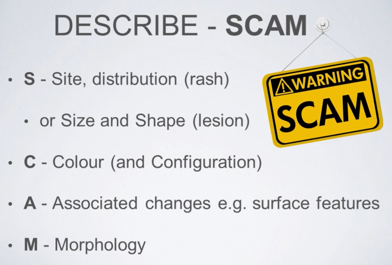 - Presenting Complaint: site of onset and evolution, duration (acute/chronic), distribution: a/symmetrical, flexors/extensors, mucous membranes, sun sites, itchy, exacerbating/relieving