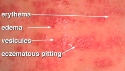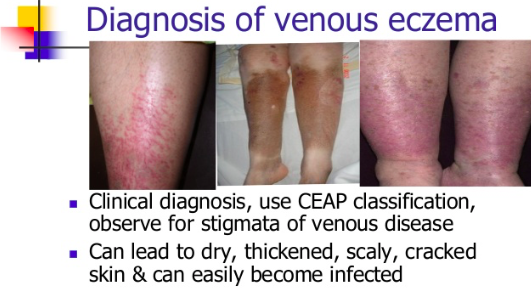 Characterized by red, itchy, scaly, or flaky skin, which may have blisters and crusts on the surface and lipodermatosclerosis may occur