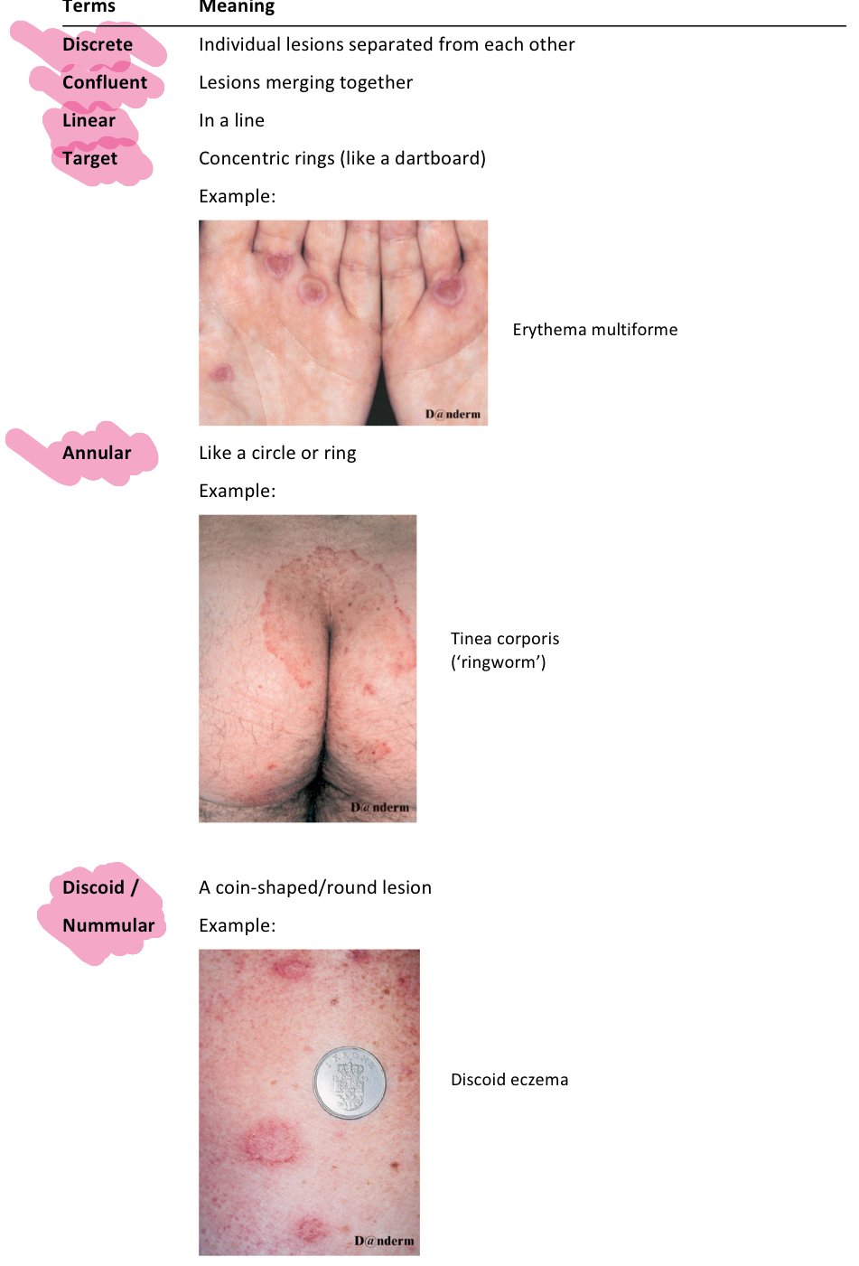 What is the difference between discoid, annular, discrete, target, linear and confluent?
