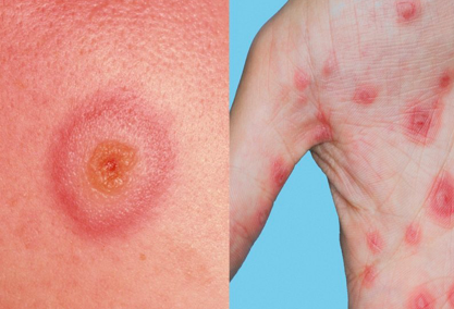 Starts as small red spots, usually on hands and feet that spreads to trunk and turn into target lesions. May be itchy