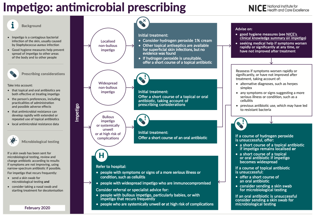 - Topical hydrogen peroxide for 5 days if localised non-bullous or if not suitable topical antibiotic like fusidic acid or mupriocin