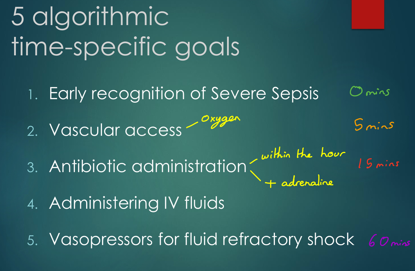 What are the 5 time specific goals for the management of sepsis in paediatric patients?