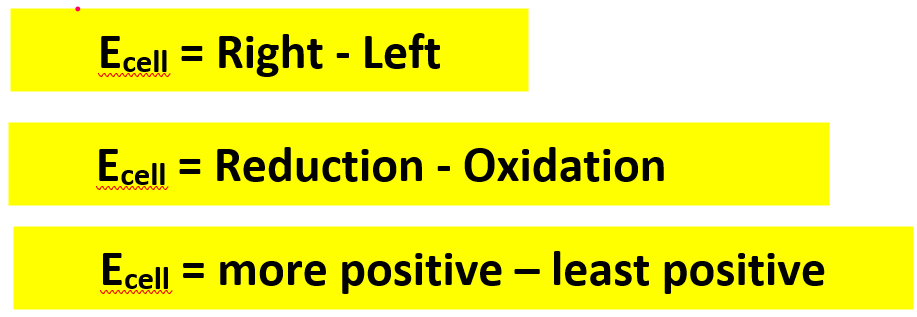 What is the equation to calculate emf/Ecell/voltage of a cell?