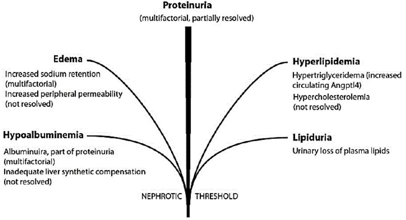 Asociación de proteinuria severa (manifestación cardinal) con edema periférico, hipoalbuminemia e hipercolesterolemia.