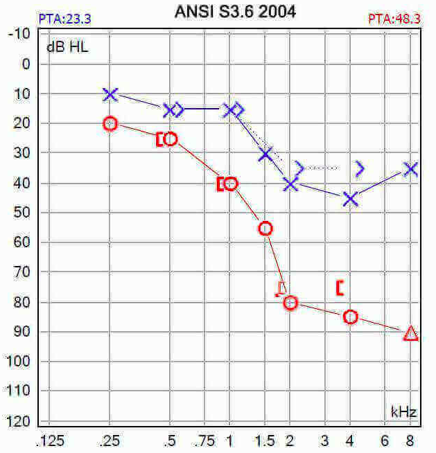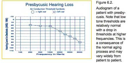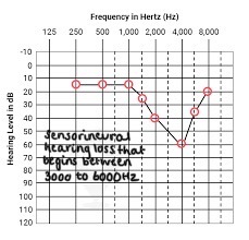Bilateral sensorineural hearing loss often slow onset and in noisy environments at first. Often noticed by other people