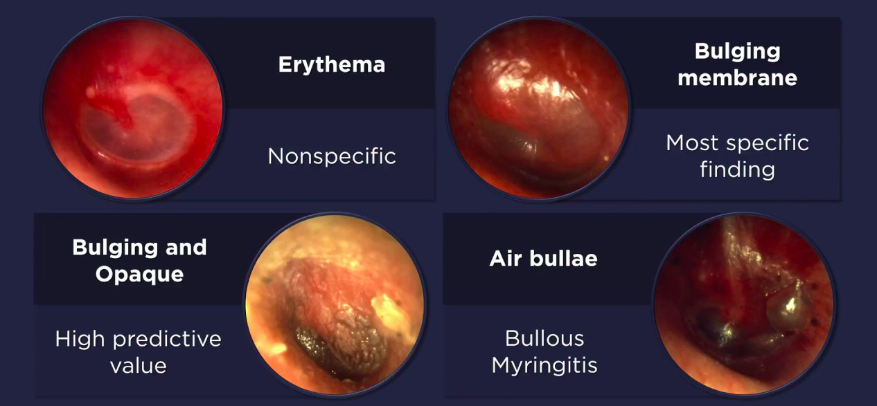 How does acute otitis media present? (Hib, S.Pneumoniae, M.Cattarhalis)