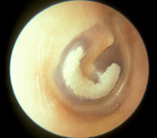 Semi-urgent referral to ENT for audiology assessment and CT. Topical antibiotics before surgical removal