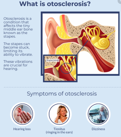 Symptoms: usually bilateral conductive hearing loss, speaking softly, hearing better in noisy surroundings, hearing sounds from within your body, dizziness and balance problems