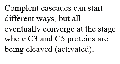 (1-3). Complement proteins are present inactive forms in the serum and are triggered via either of 3 mechanisms (+ what they are)