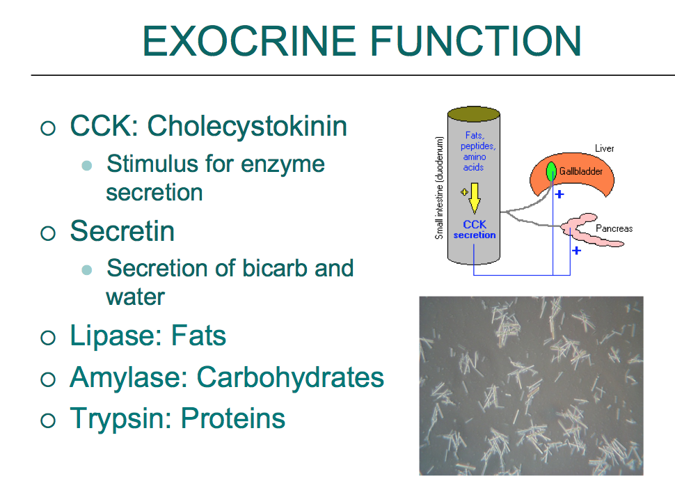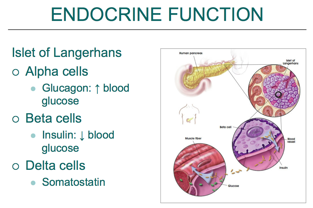 Secretes insulin, which lowers blood glucose levels.