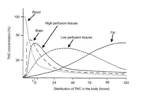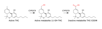 THC metabolism occurs mostly in the liver by the enzyme cytochrome P450 2C9 producing the metabolites: