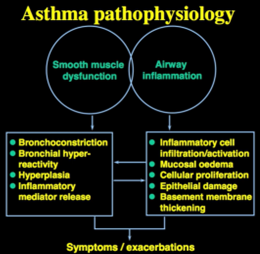 Summarise the causes of smooth muscle dysfunction and airway inflammation in asthma.