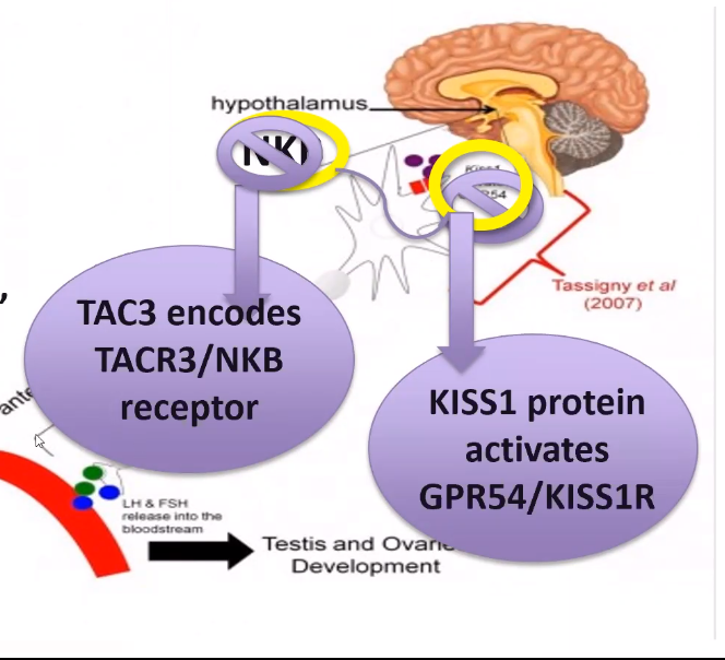 Mutation in NKB -> hypogonadotrypic hypogonadism, then reversal in adultood (not important for reproduction