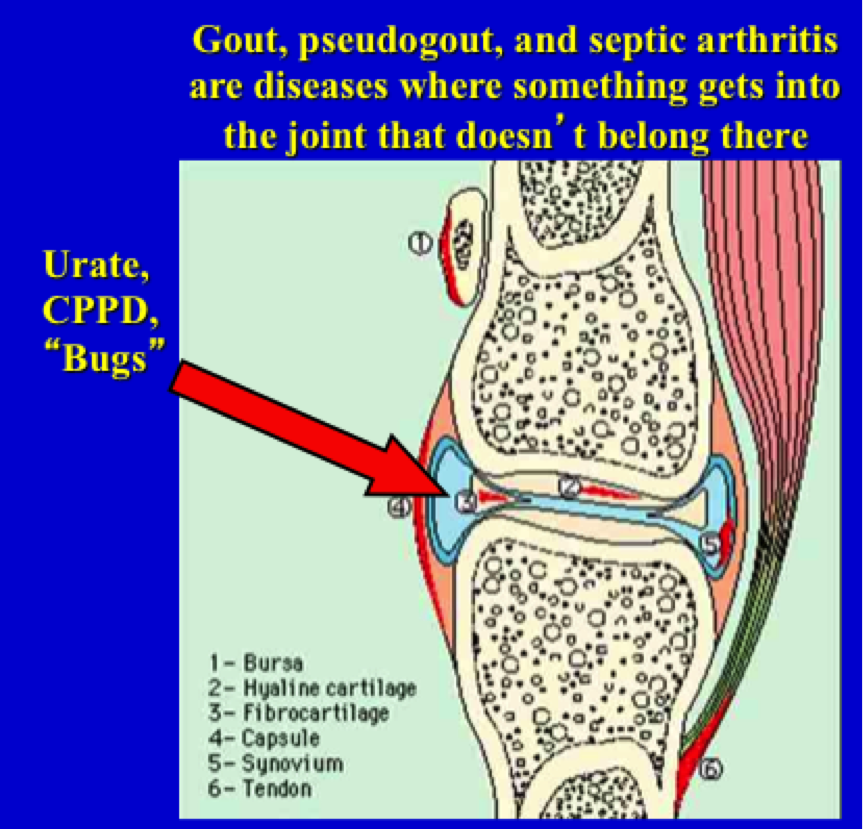 infection and the presence of things in the joint that don’t belong there (urate crystals, bacteria, CPPD- which are another kind of crystals)