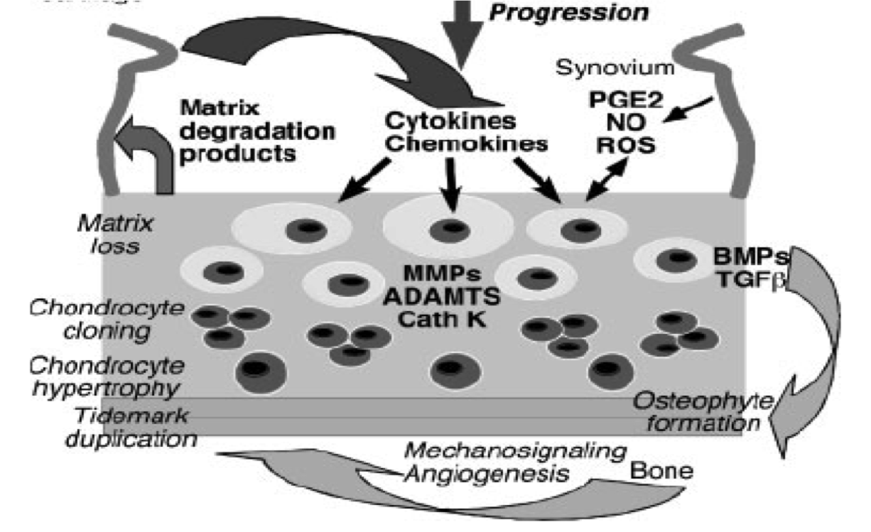 chondrocyte stress leads to proliferation and stress response such as growth factors, cytokines, cartilage-degrading proteinases, other inflammatory mediators -> matrix degradation