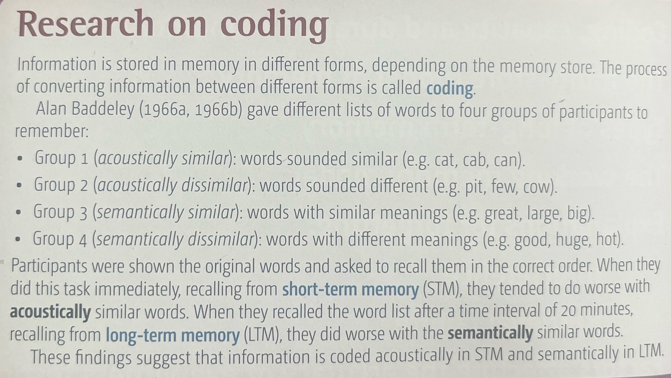 P1 - Memory Textbook > 2.0- Research into coding, capacity and duration A01 > Flashcards