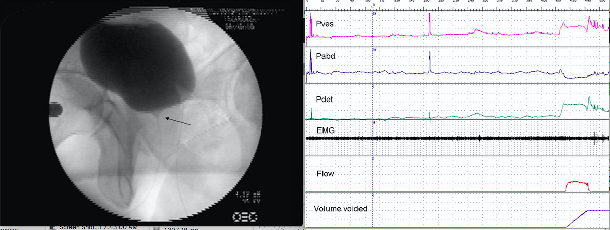 The cystogram demonstrates an open bladder neck at rest. The urodynamics tracing shows that there was no detrusor activity at the instant the image was obtained. An open bladder neck at rest in a male is highly suggestive of multiple system atrophy (MSA) in the absence of prior prostate surgery. Although other neurological diseases may result in an open bladder neck at rest, none of these are listed except MSA. Erectile dysfunction is often found in MSA, and this finding in concert with the open bladder neck at rest distinguishes this condition from Parkinson’s disease which is often clinically similar in many other respects. Other symptoms of MSA may include other autonomic dysfunctions. Bladder neck dyssynergy would have a closed bladder neck with filling. Cervical spinal stenosis and MS would not typically have an open bladder neck at rest.