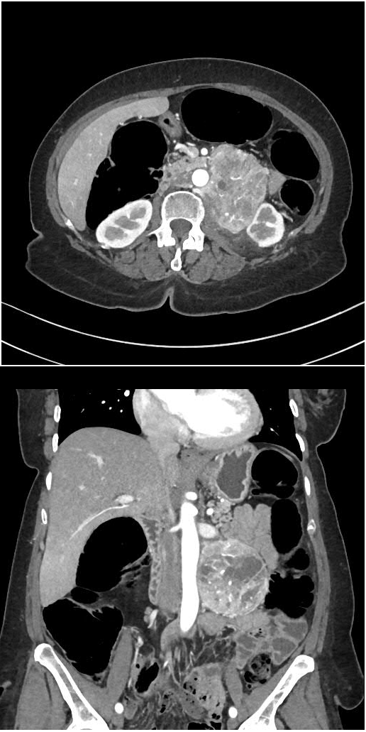 The patient has a clinical presentation, radiographic features, and laboratory studies consistent with a paraganglioma. Initial management should involve alpha-blockade to establish blood pressure control. Staging evaluation for metastases in this setting is recommended, with gallium-68 dotatate PET having emerged as the preferred imaging modality. Dotatate has a high affinity for the somatostatin surface receptor, which is expressed by paragangliomas, and thereby facilitates detection of metastatic disease which may in turn impact management. Iodine-131-MIBG represents a form of systemic therapy that may be utilized for patients with metastatic disease or locally unresectable tumors in whom a prior MIBG scan has been obtained and is positive. Meanwhile, adrenal vein sampling has been reported to have a sensitivity of 95% and a specificity of 100% for detecting lateralized autonomous aldosterone secretion but would not be indicated in the evaluation of a patient with a likely retroperitoneal paraganglioma. Both cisplatin and etoposide as well as mitotane are systemic therapy options for patients with metastatic adrenocortical carcinoma (with cisplatin/etoposide preferred) but would not be indicated here in a functional paraganglioma and without documented metastatic disease.