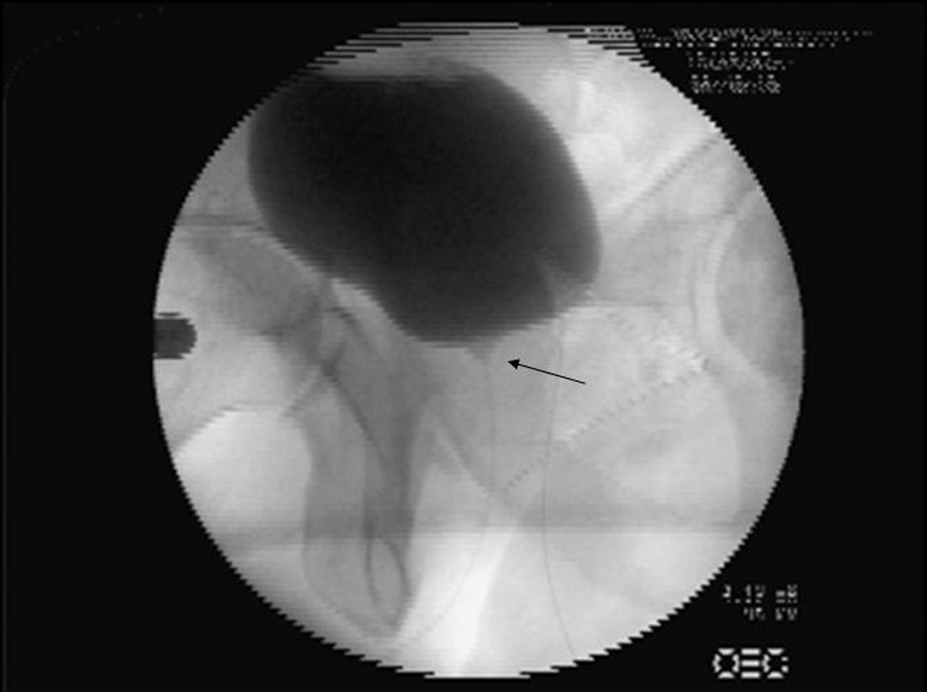 A 52-year-old man with erectile dysfunction undergoes videourodynamics for voiding dysfunction. A videourodynamic image, taken early in filling (at the point indicated by dotted line in the UDS tracing), is shown. The videourodynamics suggests a diagnosis of: