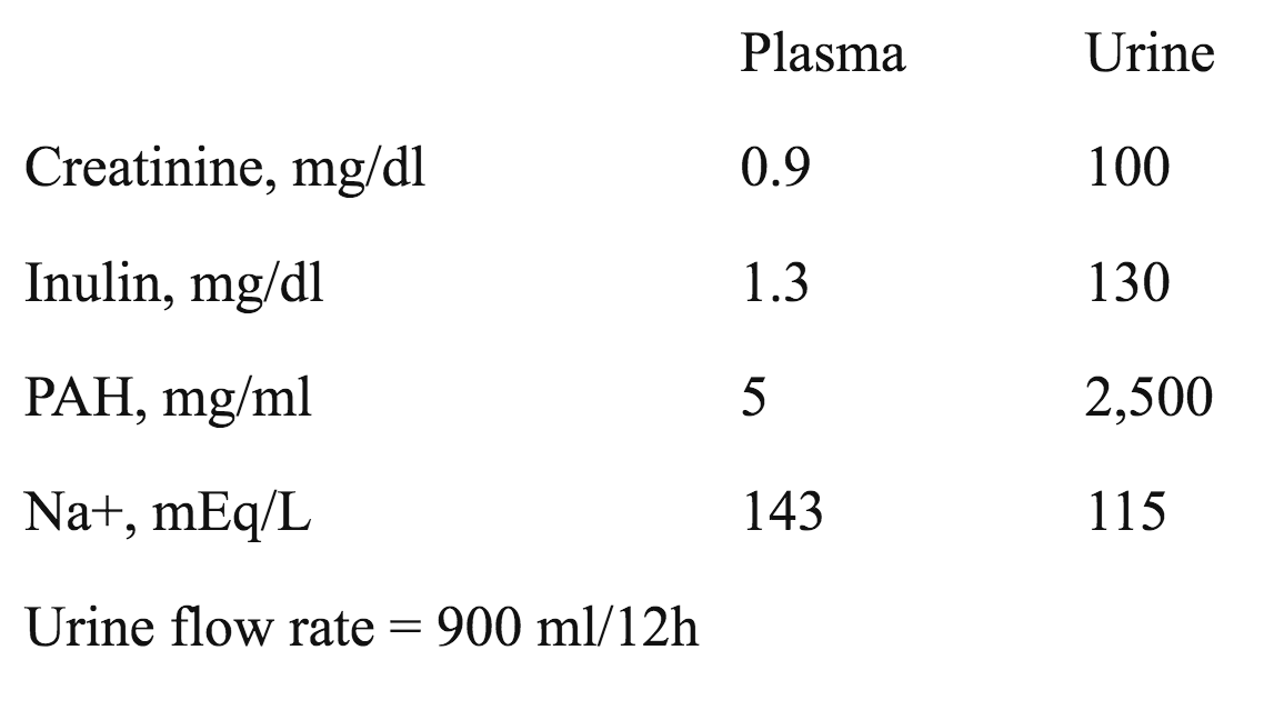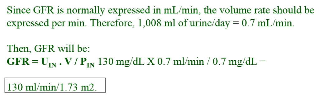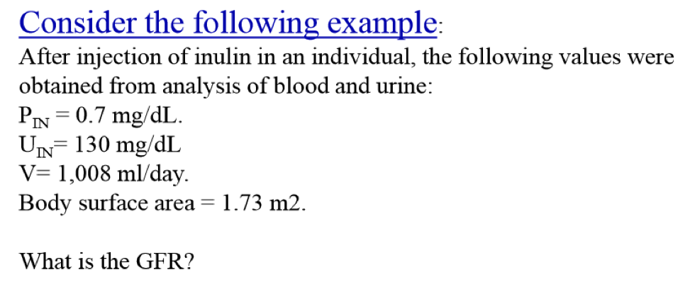 GFR = UIN . V / PIN = 130 mg/dl x 1.25 ml/min / 1.3 mg/ml = 125 ml/min.