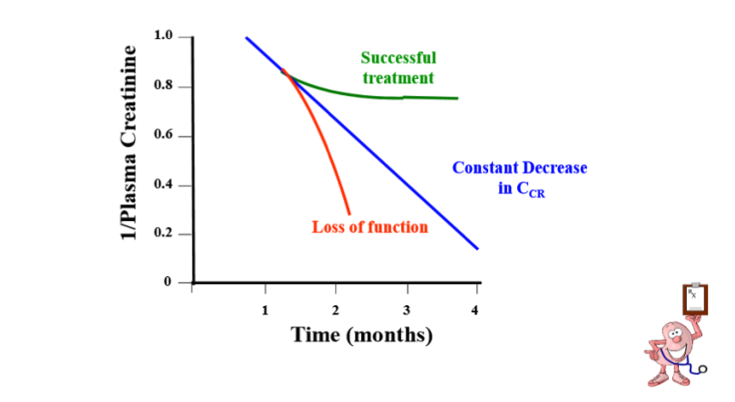 Creatinine concentration in plasma is an indicator of renal function and because GFR is proportional to the reciprocal of serum creatinine, it provides a practical and useful way to estimate the progression and prognosis of renal disease. If the disease worsens, the reciprocal value will fall; if treatment is successful, 1/PCR will not decrease.