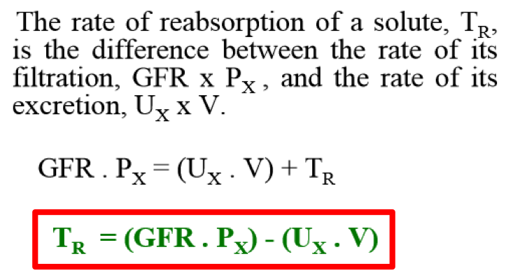 Knowing GFR, the rate of tubular reabsorption from the filtrate or the rate of secretion into the tubular fluid of substances can be measured. The rate of tubular reabsorption (TR) of a solute by the tubules can be determined by the difference between the rate at which the substance is filtered and the rate at which it is excreted: