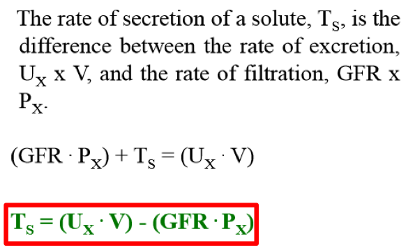 The rate of tubular secretion (TS) of a solute by the tubules can be determined by the difference between the rate of its excretion, and the rate at which it is filtered: