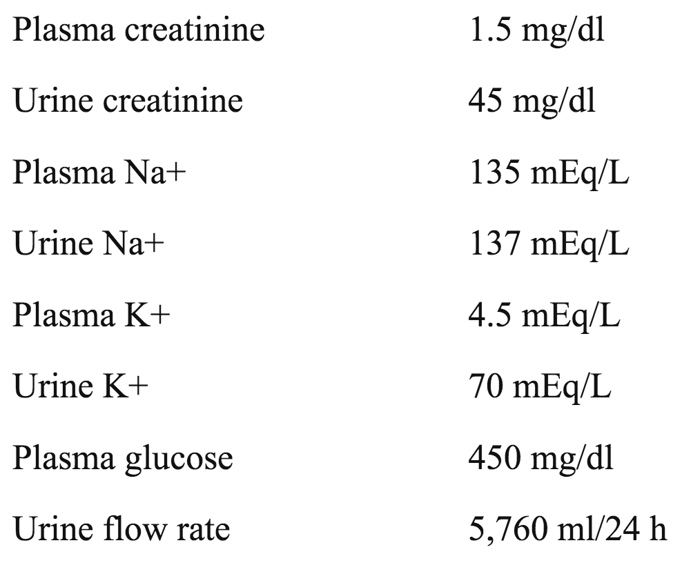 This patient has a very high plasma glucose concentration. After filtering in the glomerulus, this most probably will overload the glucose transport systems of the proximal tubules. The high glucose concentration released in the urine will produce solute diuresis giving the patient the high urine flow rate.