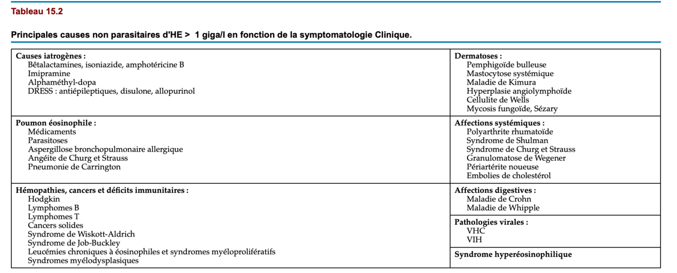 + Enfin, il faut mentionner, chez les patients hospitalisés, la possibilité, rare, d’éosinophilie liée aux produits de contraste iodés ou à l’héparine.