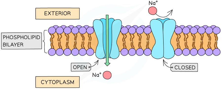 ~ Pores in the membrane for charged particles to diffuse through down their concentration gradient.