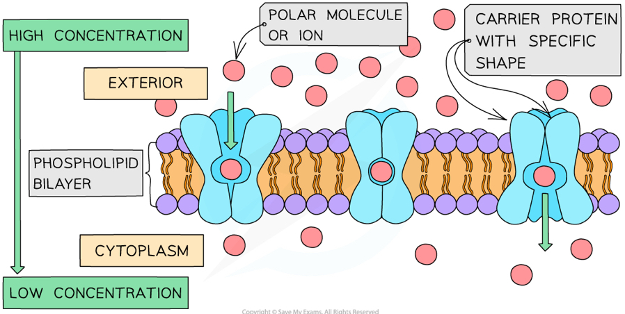 ~ Use of transport proteins to move large molecules (Amino acids and glucose) and polar molecules (ions).
