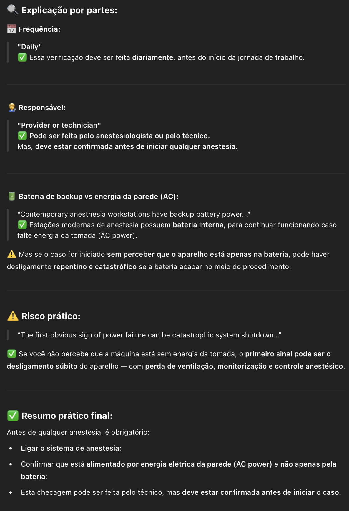 (Item 3). O que deve ser verificado diariamente quanto à energia do sistema de anestesia antes de iniciar os procedimentos?