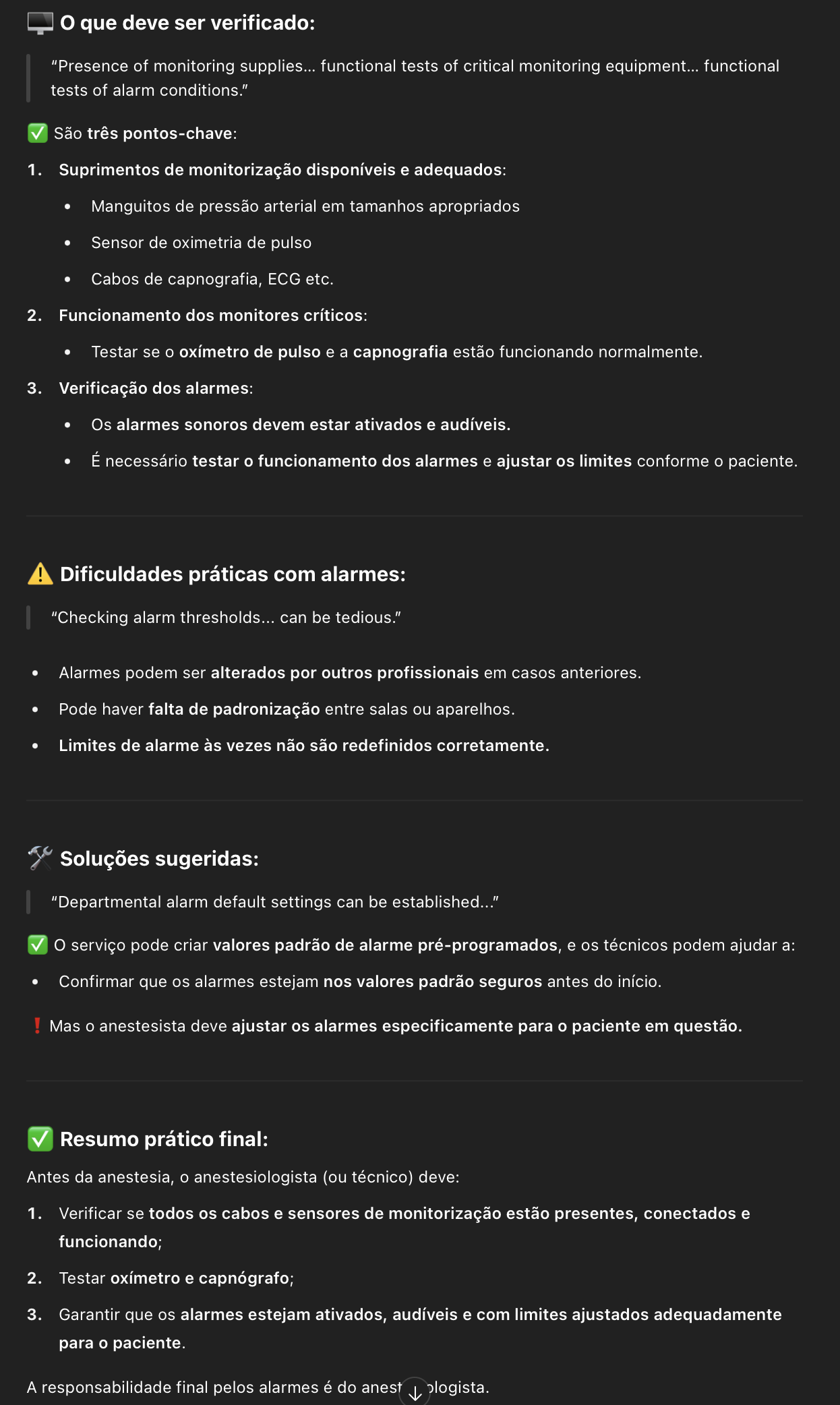(Item 4) . O que o anestesiologista deve verificar antes de cada caso quanto à monitorização e alarmes? (2)