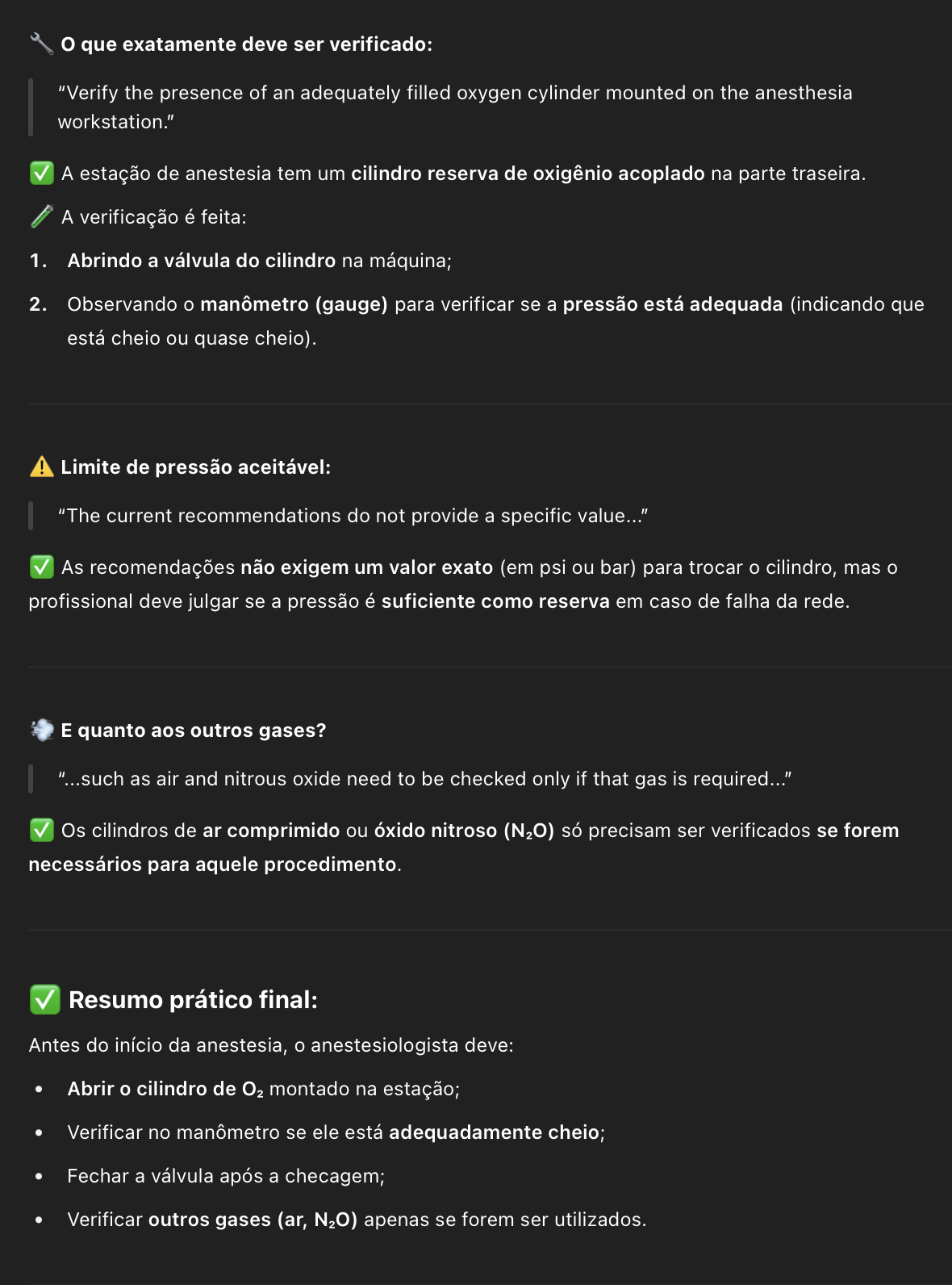 Esse cilindro serve como fonte de backup em caso de falha da rede hospitalar. Cilindros de ar ou óxido nitroso só precisam ser verificados se forem usados no caso.