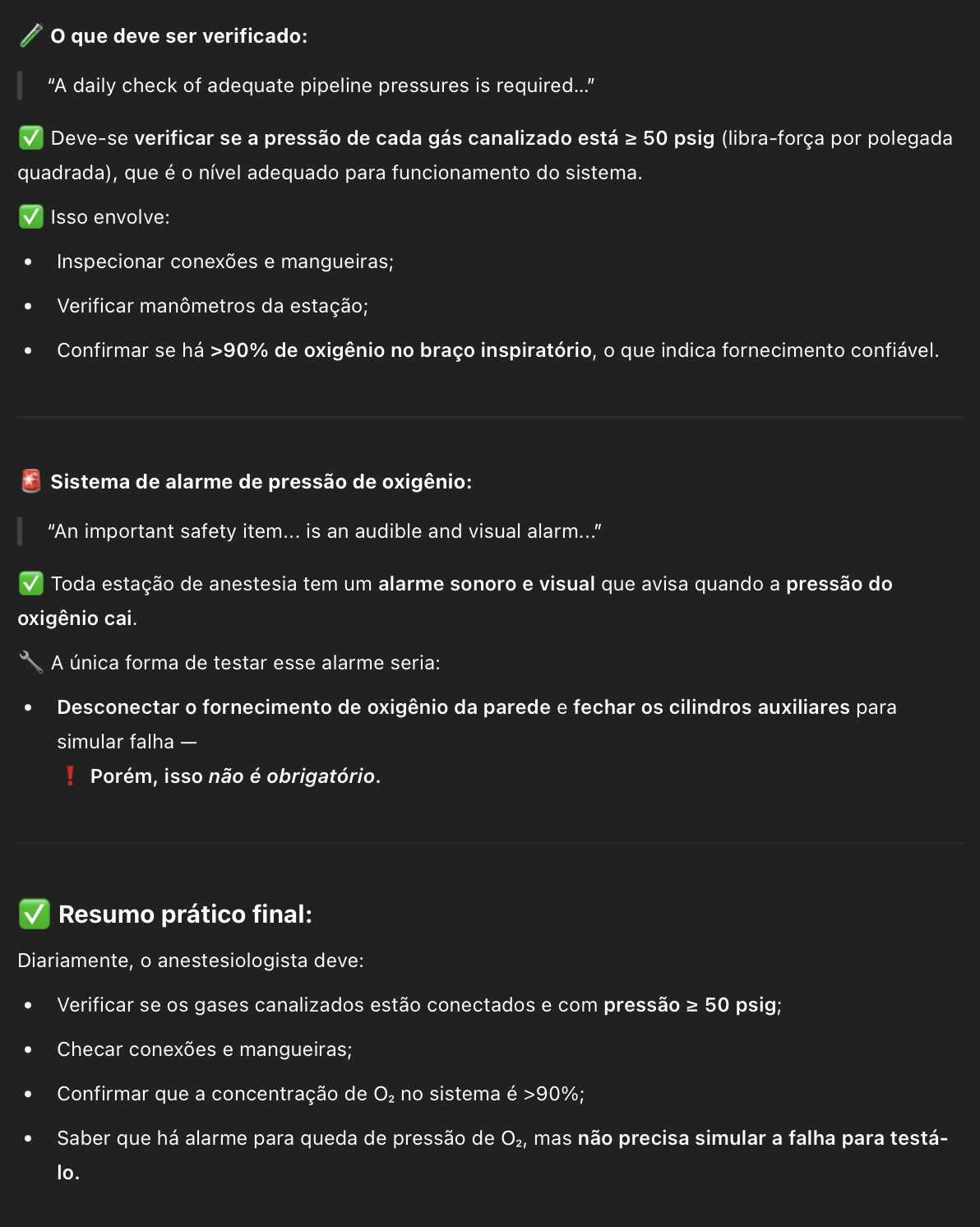 Há alarme para queda de pressão de O₂, mas não é obrigatório simular falha desconectando o sistema. A verificação deve ser feita pelo anestesiologista, mesmo que o técnico participe da rotina.