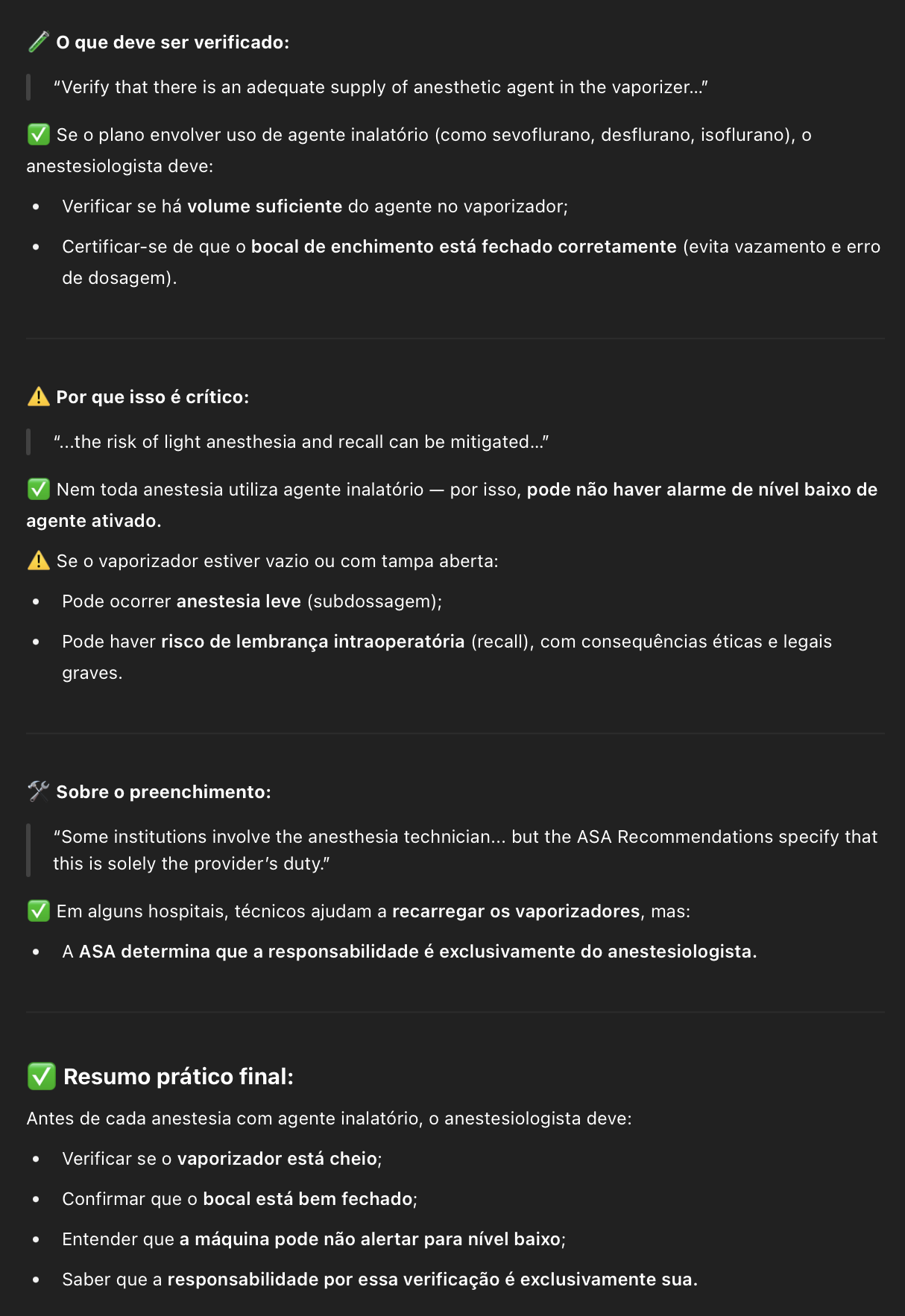 Mesmo que o técnico prepare o sistema, a verificação final é responsabilidade do anestesiologista, e deve ser feita antes de cada novo caso.