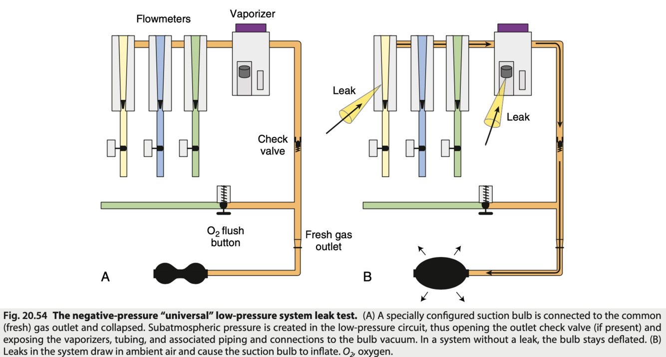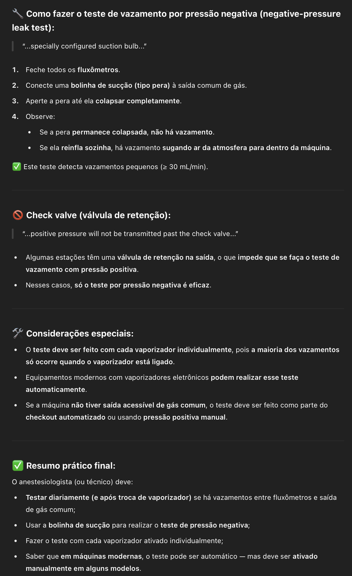 O teste deve ser feito com cada vaporizador ligado e sempre que um for trocado. Máquinas com válvula de retenção exigem esse teste, pois o de pressão positiva não funciona. Equipamentos modernos podem realizar o teste de forma automática, mas o recurso precisa ser ativado.