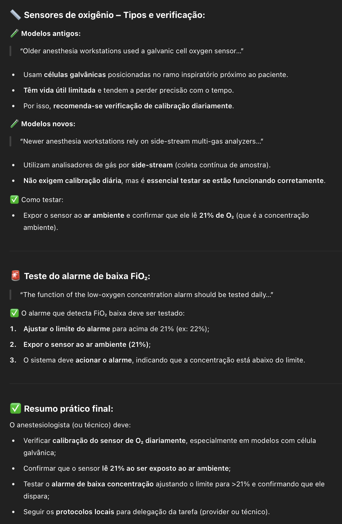 Em monitores com célula galvânica (mais antigos), a calibração deve ser feita diariamente. O alarme de baixa FiO₂ deve ser testado ajustando o limite para >21% e confirmando que ele dispara em ar ambiente. Essa verificação pode ser feita pelo anestesiologista ou técnico, conforme protocolo local.