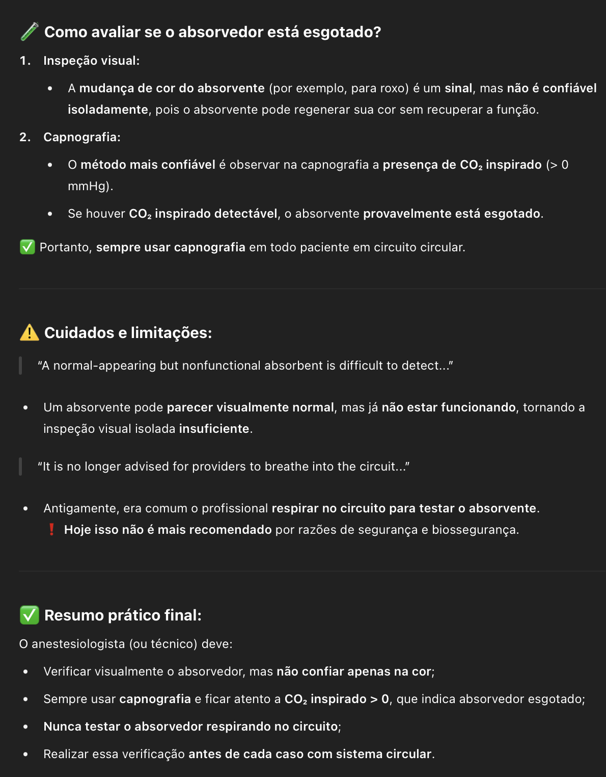 Utilizar capnografia para identificar CO₂ inspirado > 0, que indica absorvedor esgotado. Não é mais recomendado respirar no circuito para testar o absorvedor. Essa checagem é essencial em sistemas com circuito circular.
