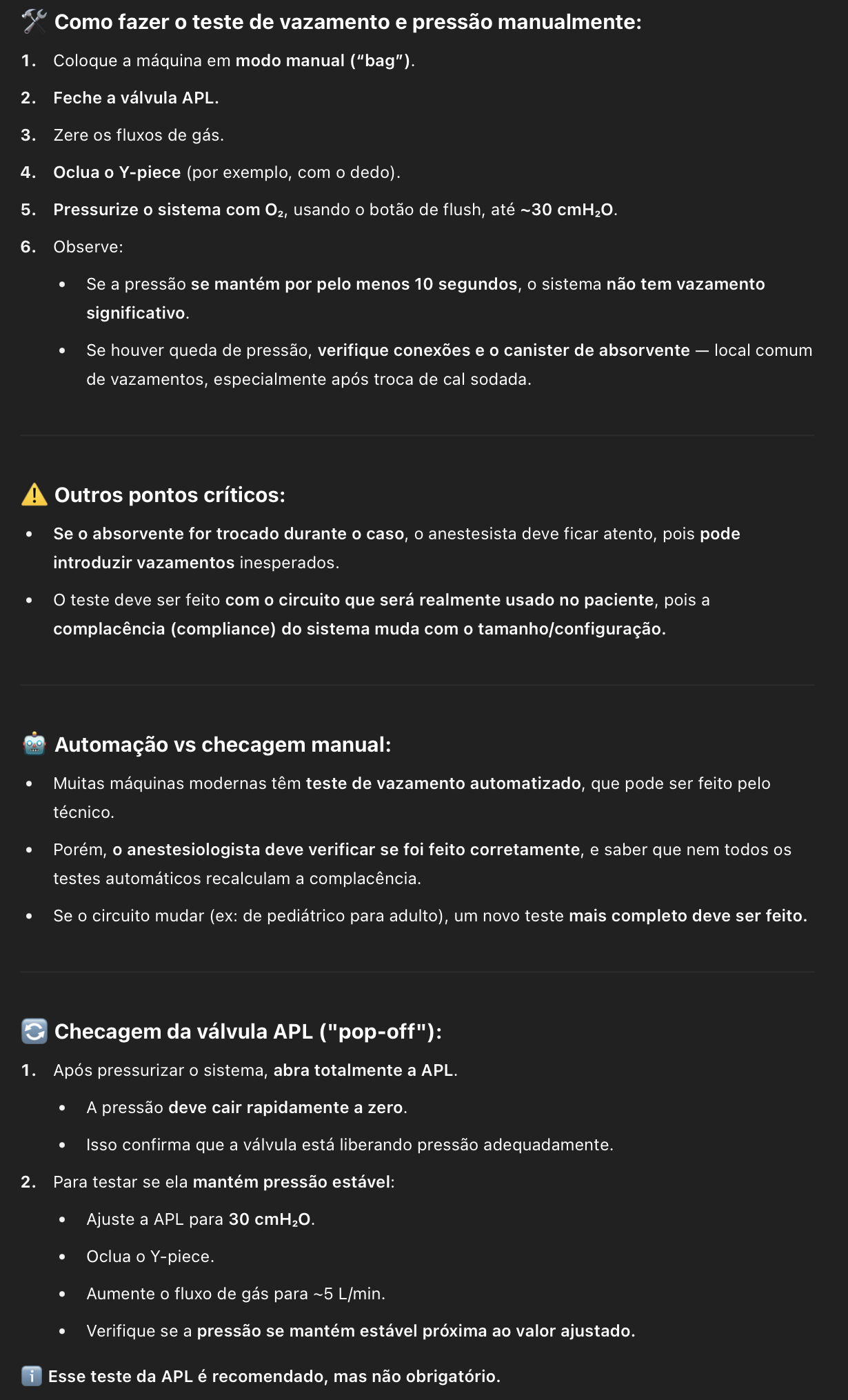 A estabilidade da pressão pode ser testada ajustando a APL para 30 cmH₂O e observando manutenção com fluxo de 5 L/min. O teste deve ser feito com o circuito que será usado, especialmente após trocar o absorvedor.