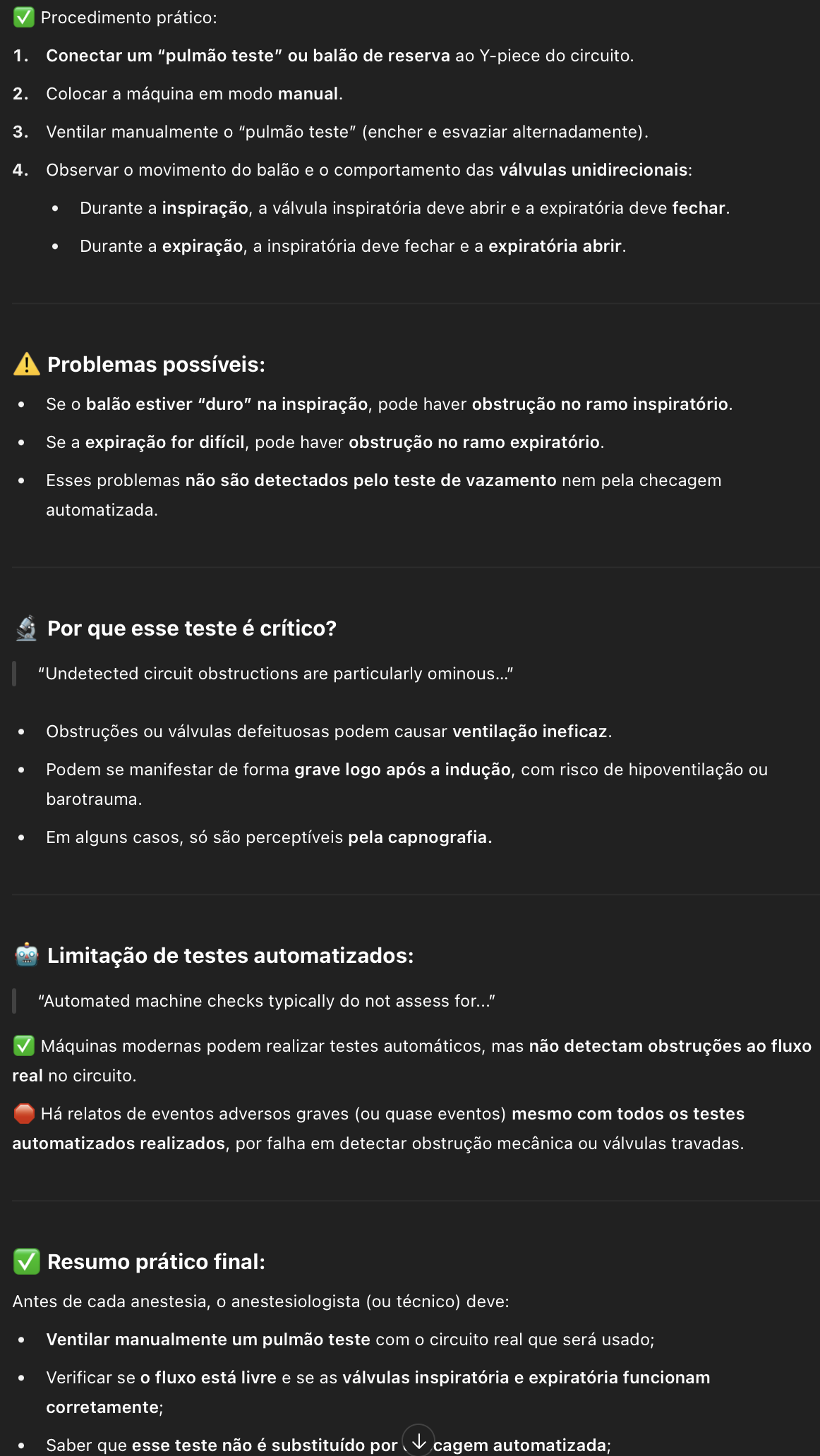 Esse teste detecta obstruções mecânicas que não são identificadas por testes automatizados ou de vazamento. É crítico para prevenir falhas ventilatórias logo após a indução.