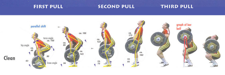 The first pull to the knees, the transition, the second pull to the hips and the catch.