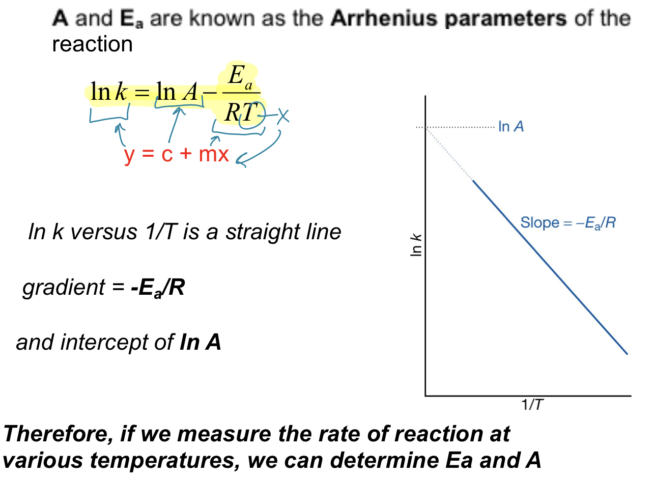Arrhenius equation describes the effect of temperature on rate constant (k) and reaction rate