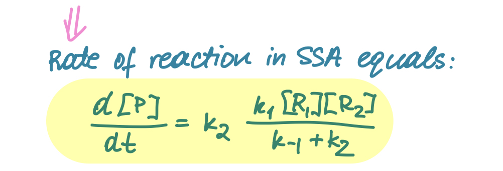 Approximation that intermediate product is constant in a two step reaction - used up as soon as made - allows to figure out the rate of the reaction only using reaction rates (k1, k2) and reactants conc ([A], [B])