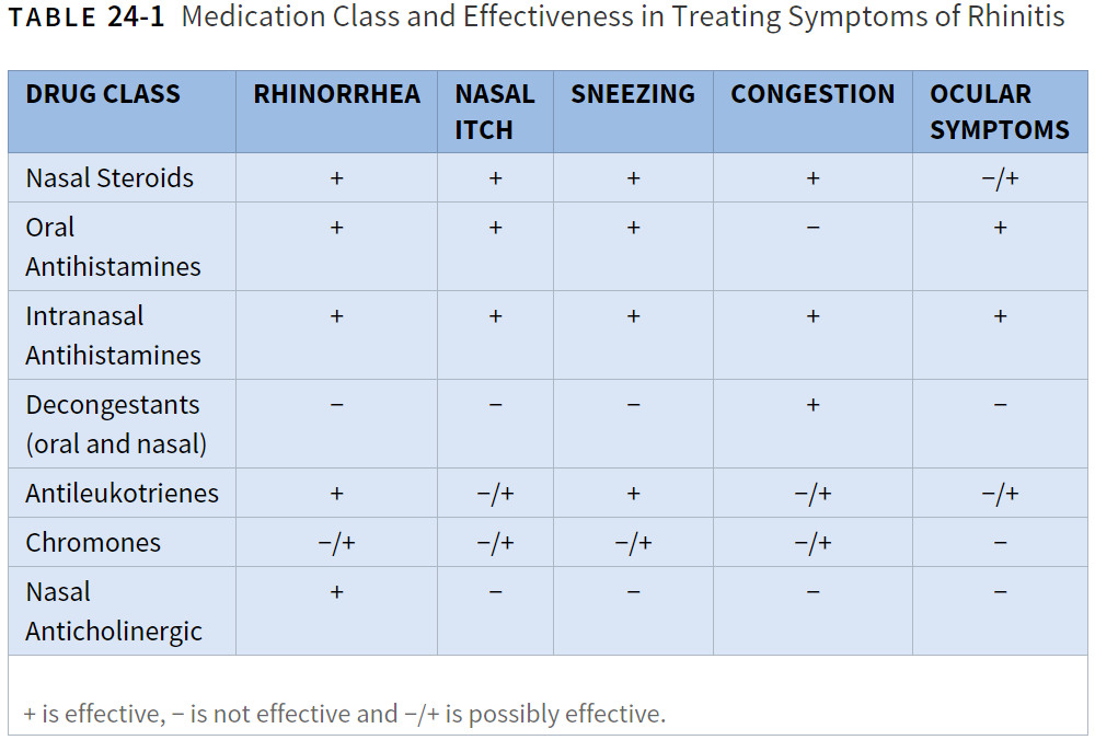 Corticosteroids, both topical and systemic, are effective therapy for treatment of both inflammatory and noninflammatory causes of rhinitis. Topical and oral antihistamines are also available treatments. Intranasal anticholinergics are useful for rhinorrhea. Topical chromones that work as mast cell stabilizers and antileukotrienes may also be used in allergic rhinitis. Topical and oral decongestants are also available for temporary treatment of rhinitis over the counter, but have significant side effects if used extensively. See Table 24-1.