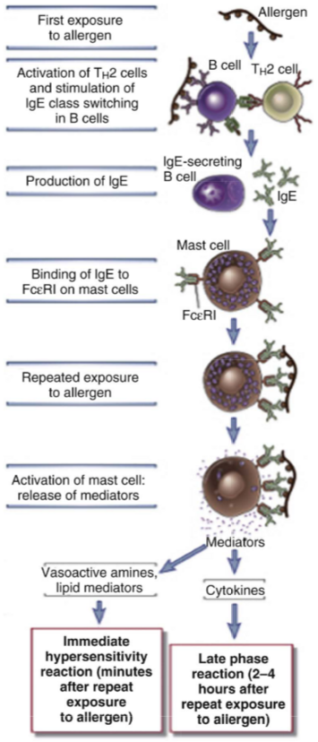 Immediate hypersensitivity diseases are initiated by the introduction of an allergen, which stimulates TH2 reactions and IgE production. IgE sensitizes mast cells by binding to FcεRI, and subsequent exposure to the allergen activates the mast cells to secrete the mediators responsible for the pathologic reactions of immediate hypersensitivity.
