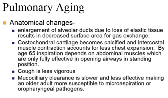 Increased lung compliance, less elastic recoil, closing volumes increase, more of smaller airways close, upper lung better ventilated, lower lung better perfused, more v/q mismatch.
