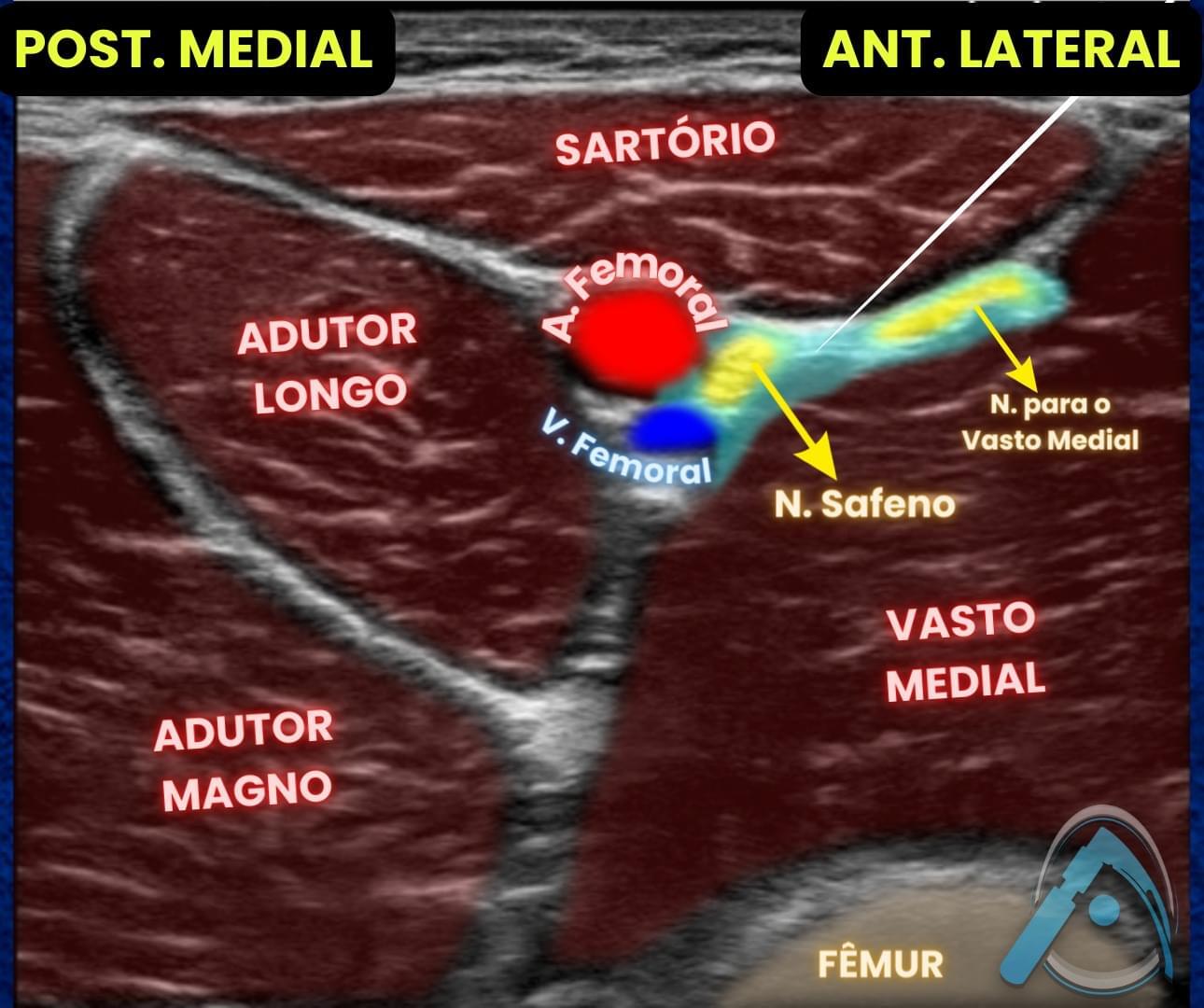 Veja as estruturas do **bloqueio do nervo safeno* no triângulo femoral distal: