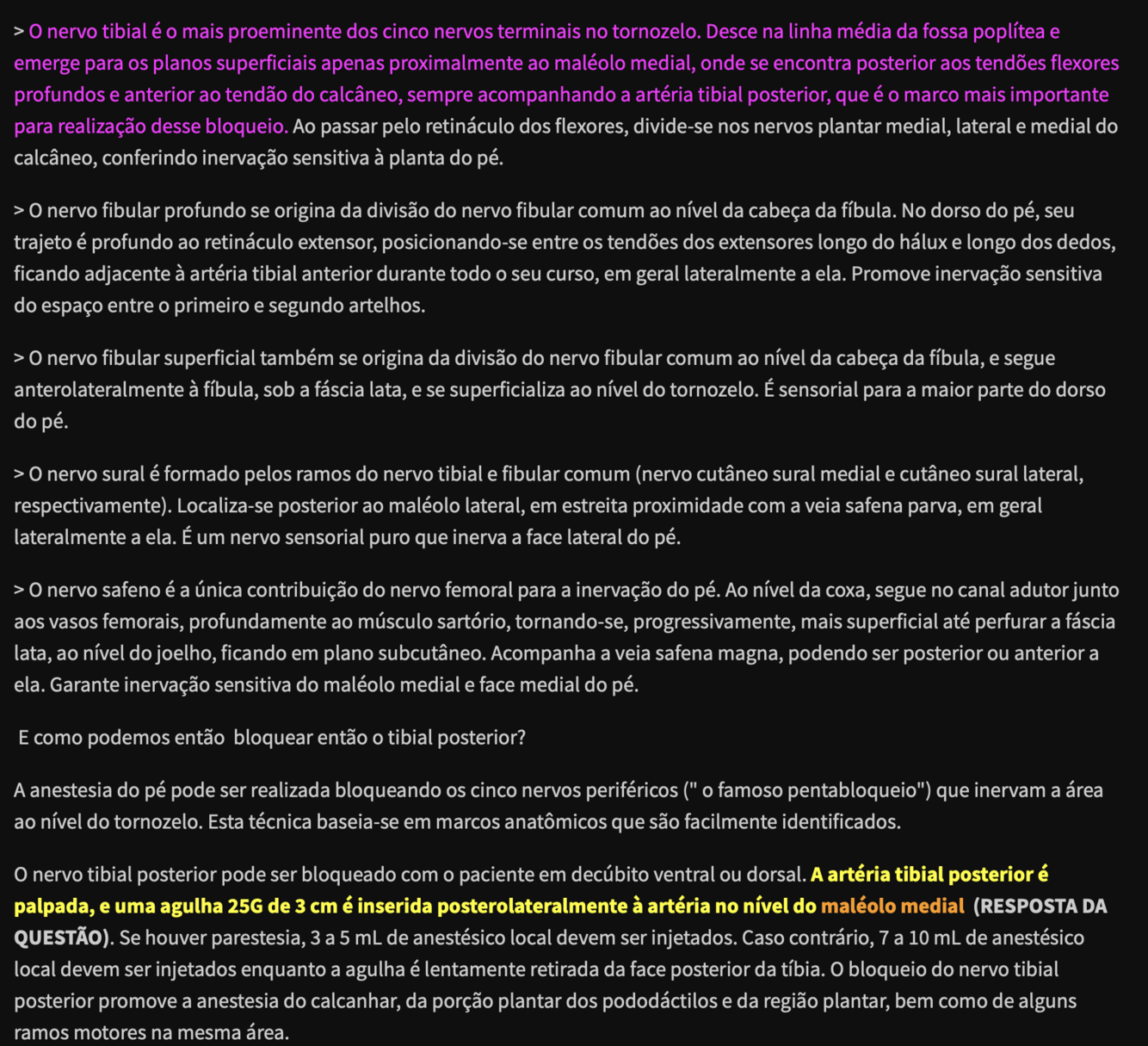 O safeno (ramo sensitivo terminal do femoral) inerva a parte medial da perna, desde o joelho até o maléolo medial. Todo o restante, na parte sensitiva e motora, é coberto pelo nervo ciático e seus ramos (tibial e fibular). Logo, como apenas o ciático foi bloqueado, a região do maléolo medial não foi anestesiada (ausência de bloqueio do nervo safeno).
